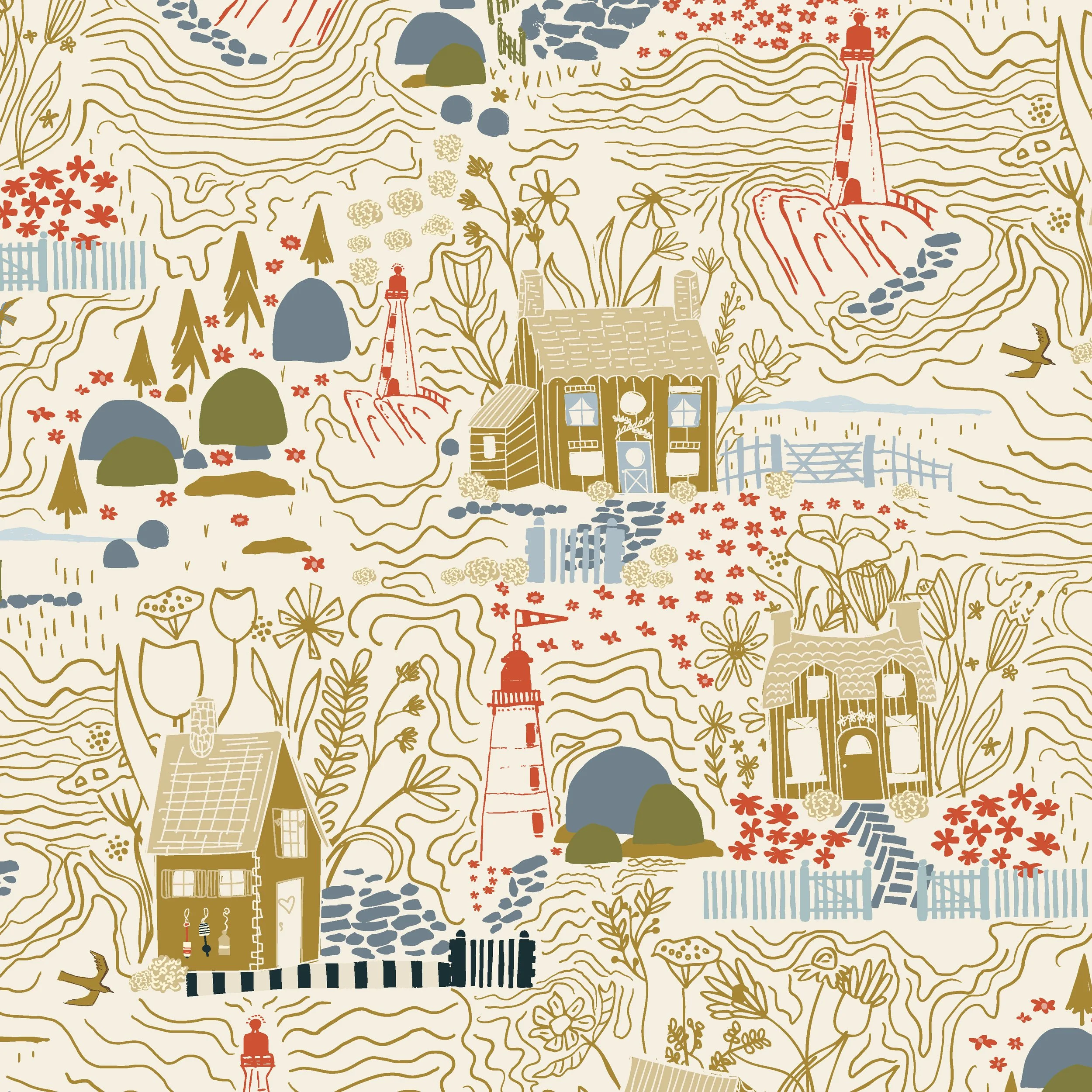 The Rocky Coast collection captures the rugged beauty of northern shorelines, where weathered cottages, windswept cliffs, and wild coastal florals meet the mystery of tide pools and headwaters. With a palette of deep marine green, ochre, sun-washed neutrals, and marine red, it carries the strength of the sea and the warmth of memory—ever-changing, yet timeless.